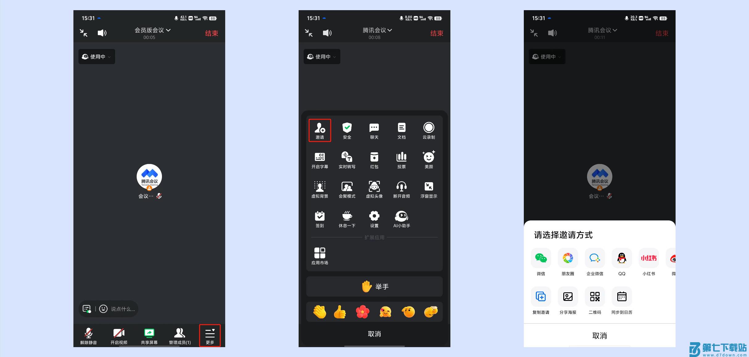 会中点击底部工具栏【更多】->【邀请】->点击选择邀请方式分享给参会成员即可;