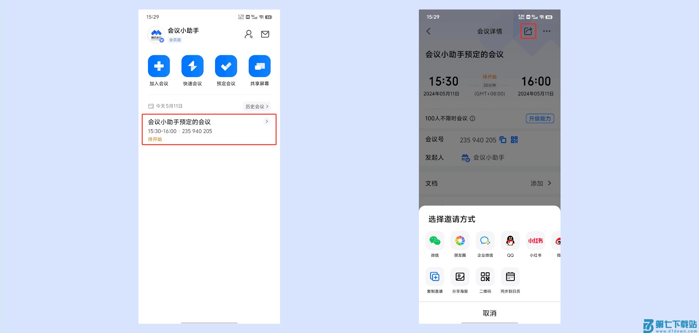 会议外点击会议列表中的会议,进入会议详情页,点击右上角的“分享”按钮,选择合适的邀请方式分享给与会成员即可;