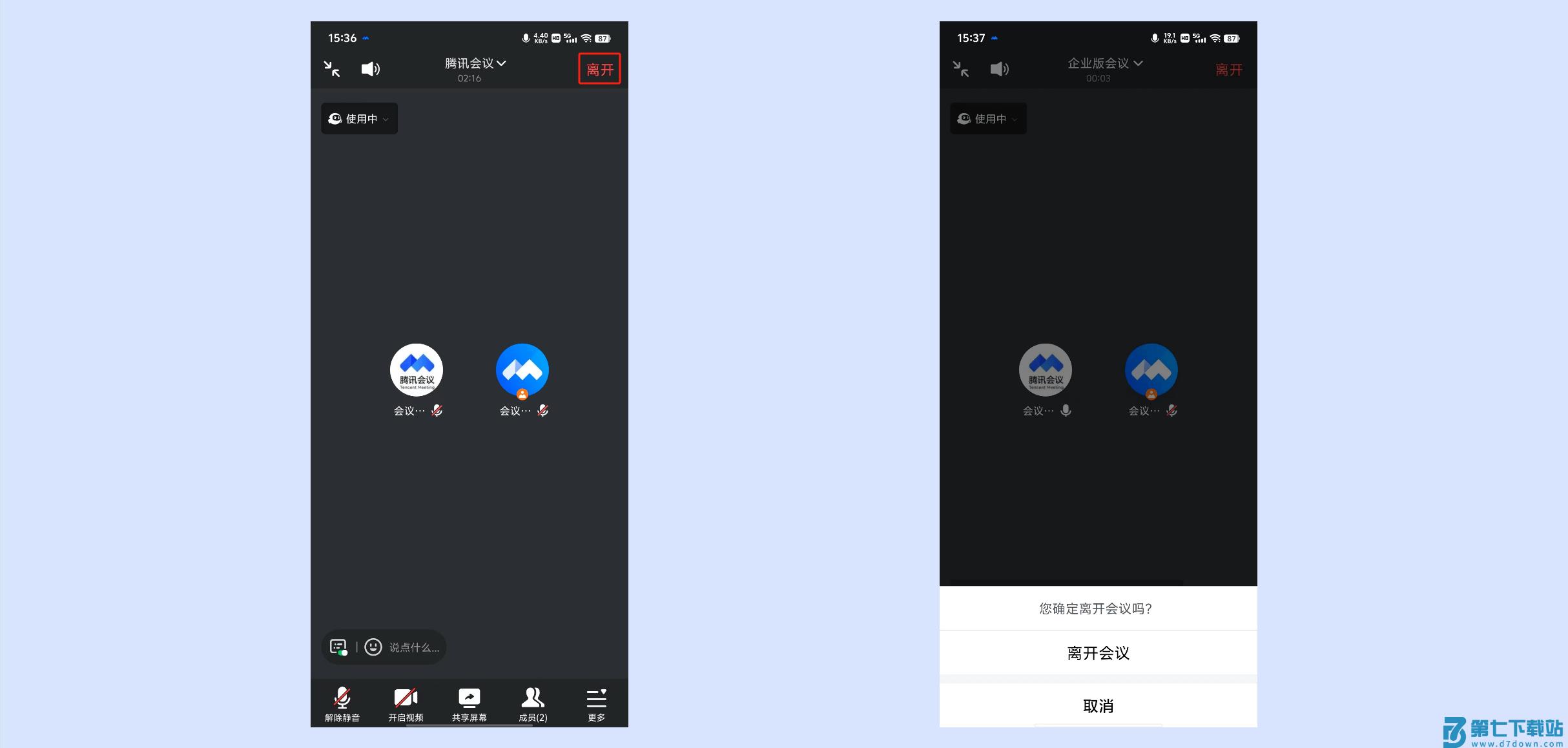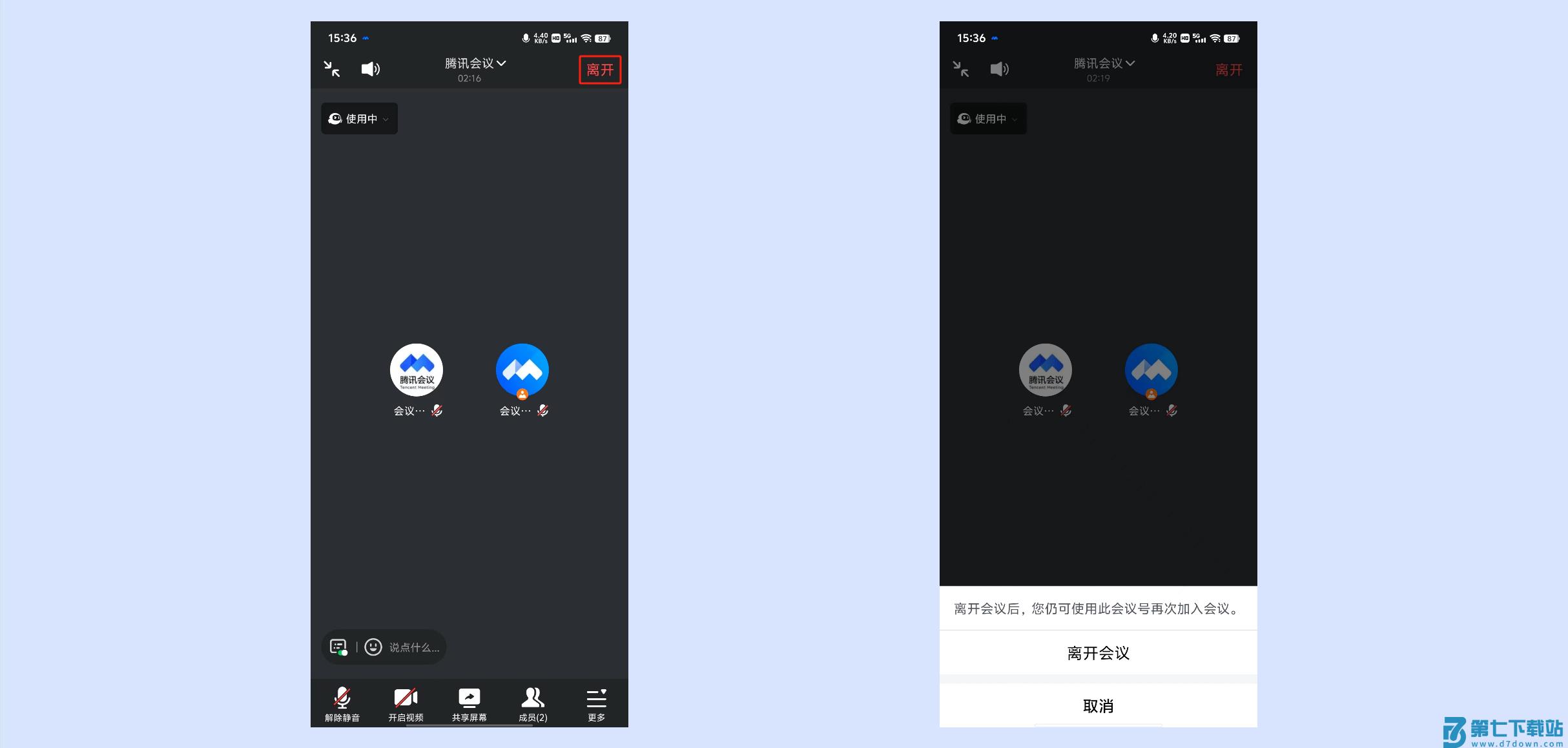 当您身份为成员时,该按钮为离开会议,您点击以后可以选择离开会议,在30天内(以主持人设置的预定开始时间计时)您都可以随时回到该会议(会议被删除则无法再进入)。