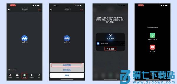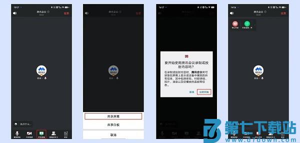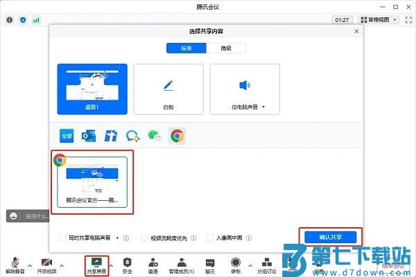 1.会中单击底部工具栏共享屏幕>选择共享内容,并单击确认共享,即可开启屏幕共享。