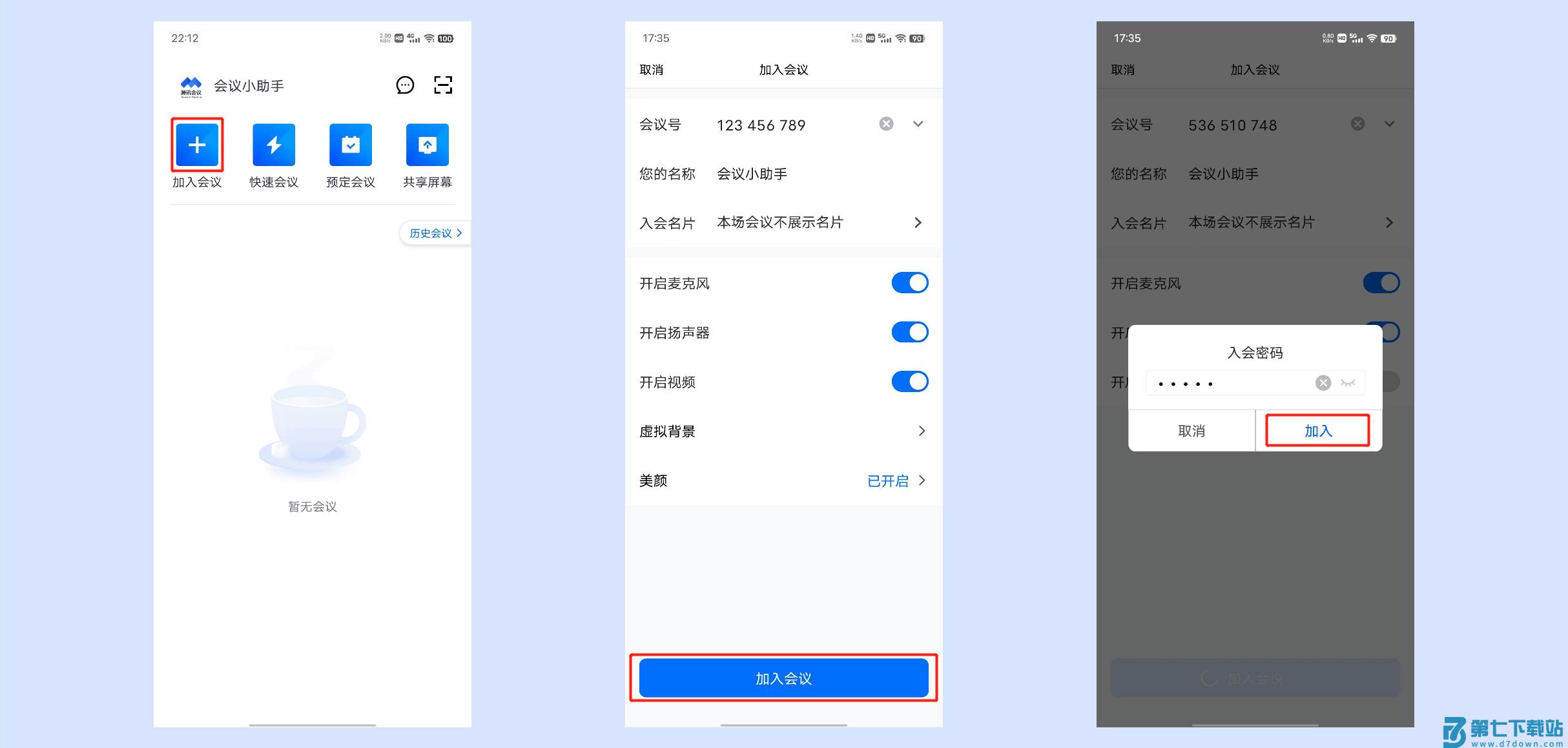 加入会议: 点击“加入会议”,然后输入会议号和您的会议昵称,您即可进入该会议;