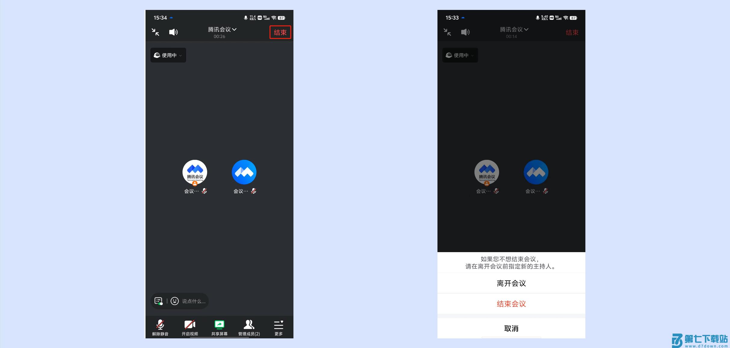 ①当您的身份为快速会议主持人时,您可以点击右上角【结束】选择【离开会议】或【结束会议】;