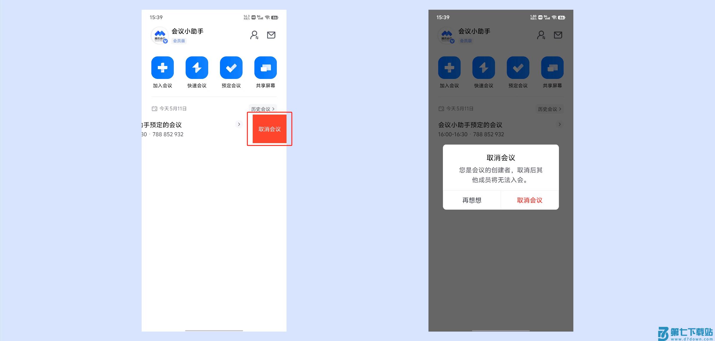 ③结束会议是指您将会议中的其他成员全部移出。在30天内(以预定开始时间计时)您都可以随时回到该会议,若您想删除这个会议,30天内不再允许进入,您可以在腾讯会议主界面“会议列表”处点击这个会议,然后选择删除会议(当会议中有人的时候无法删除会议,您必须先点击结束会议,将所有人移出)。