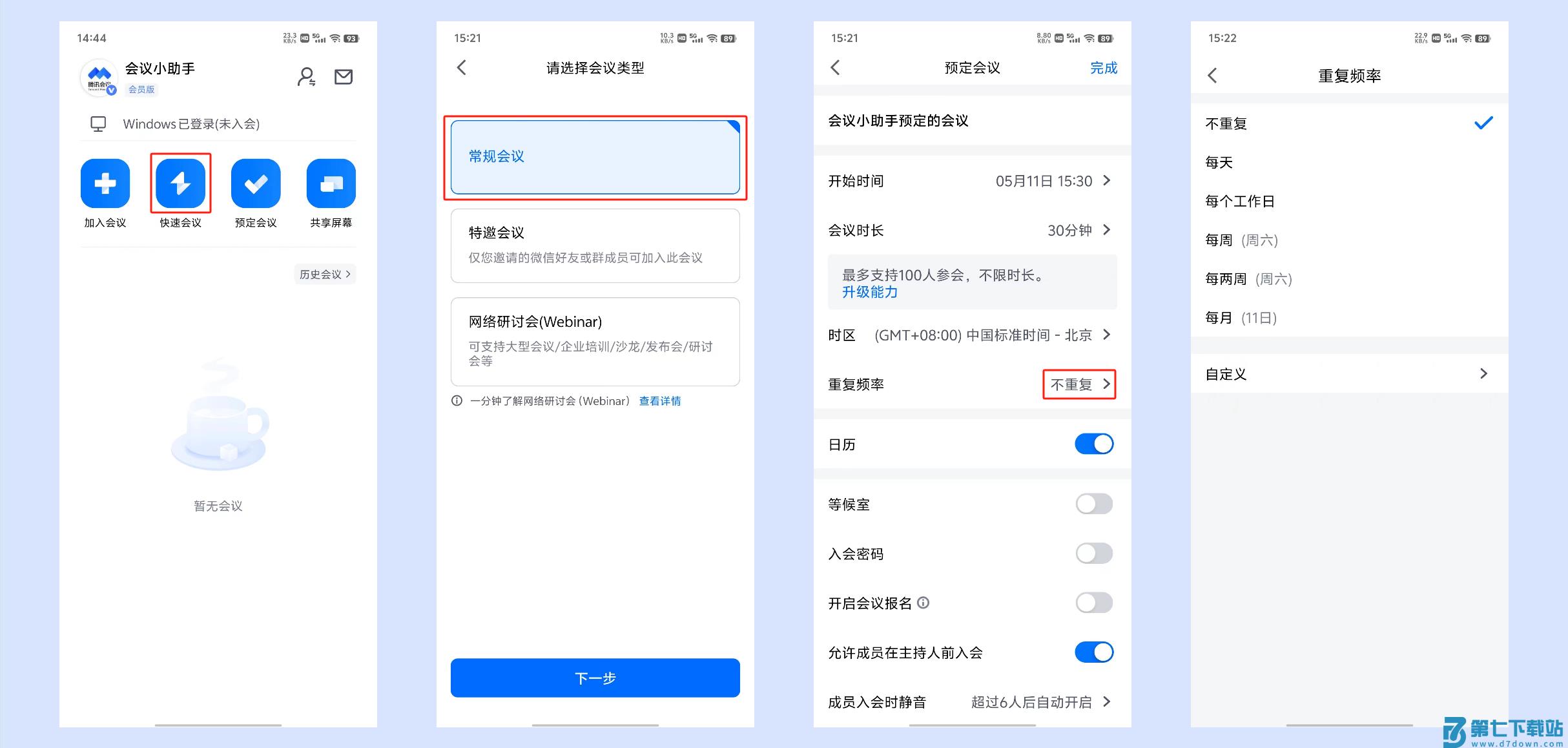 除了预定普通的会议,您还可以通过腾讯会议预定周期性会议——即在您设定好会议频率和会议次数(或是时间段)后,自动帮助您预约会议;