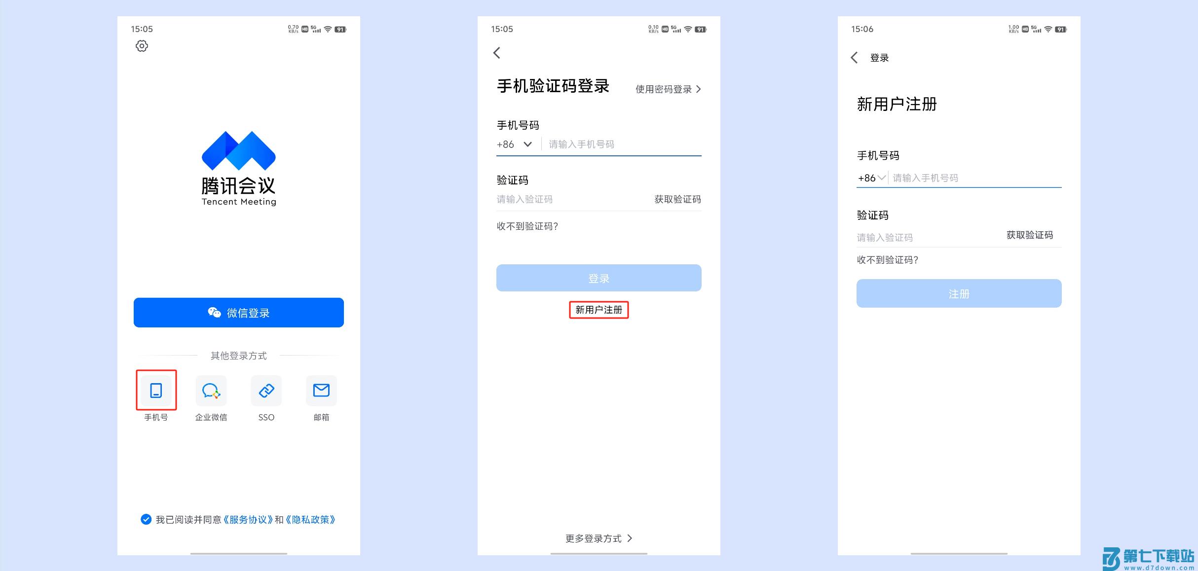 打开腾讯会议,点击“手机号登录”按钮,进入帐号密码登录页面,点击“新用户注册”进入注册页,根据要求填写对应的信息并完成注册。
