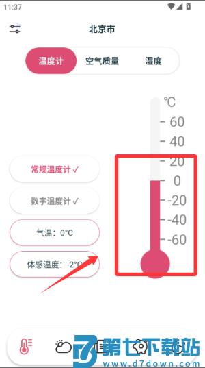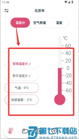 2、温度计:智能测量当前的天气温度、体感温度,出行更便利。常规的温度计、数字温度计,可随时切换,还可查看当前空气的质量情况,空气湿度情况。