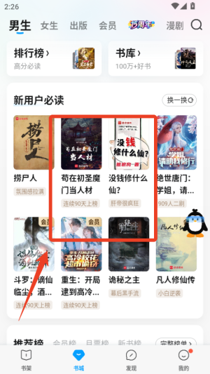 2、在书城页面根据分类标签或排行榜筛选书籍,也可以通过搜索框直接查找目标作品。