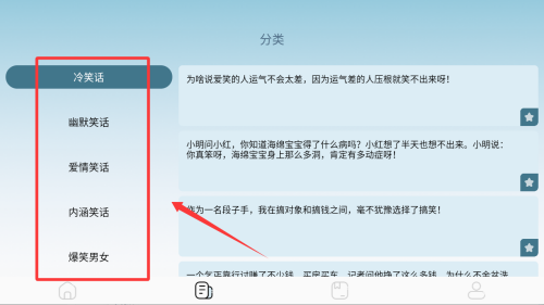 1、浏览分类或推荐内容:通过分类导航查看不同类型笑话,或依据系统推荐发现潜在感兴趣的幽默段子。