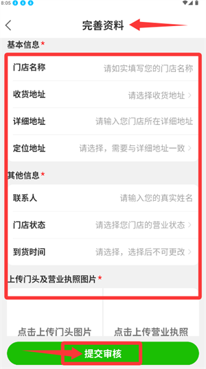 3、随后填写门店地址等资料,上传图片后提交等待审核结果。
