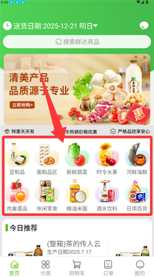 4、进入首页可按分类浏览,选择所需采购的食材商品。