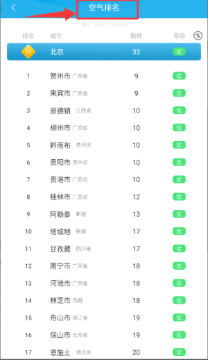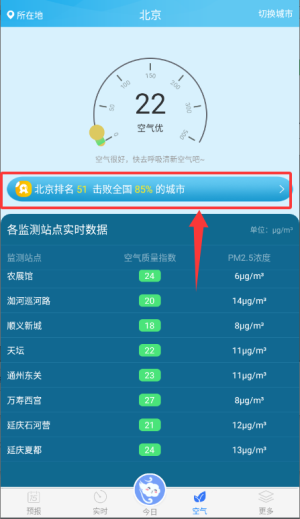 2、在空气页面找到北京排名区域,点击进入详细列表界面。