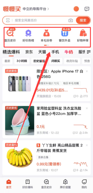 3、首页具备历史价格查询、热门好价榜单、优惠券领取以及外卖与商品推荐板块。
