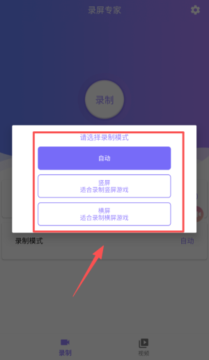3、进入录制模式选择,可根据内容挑选自动,竖屏或横屏模式进行视频录制。