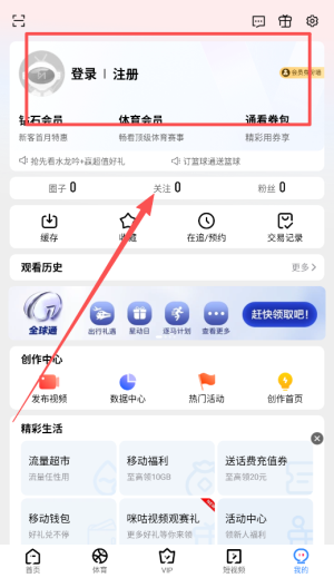 1、打开咪咕视频应用后先完成注册登录这样能领取新用户福利比如免费观影券和流量包。
