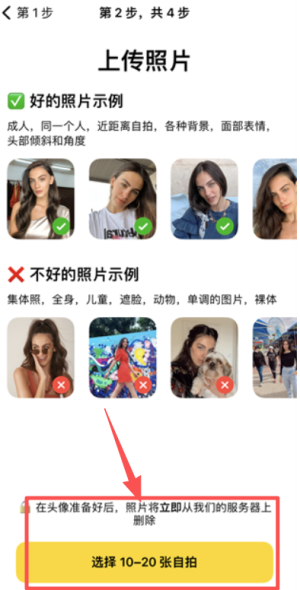 4、下一步,就是上传照片了。APP需要同一个人、近距离自拍,最好角度、表情和背景多样化一些,大约需要10-20张左右。