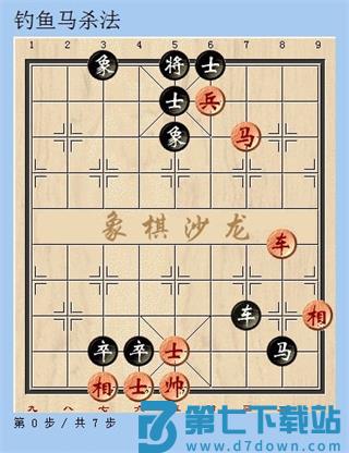 用马在对方三。三或七。三位置上“照将”,或者控制对方将的活动,然后借马之力,用车或兵将死对方,称为“钓鱼马”杀法。