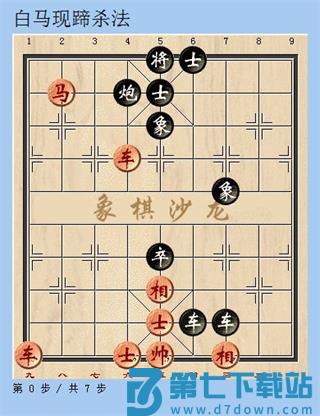 运用弃车引离战术,造成对方九宫士角的防守据点失控,使处在对方下二路横线上的马,能够“挂角照将”而构成的巧妙杀法,称为“白马现蹄”杀法。