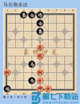 马与对方将在同一条直线或横线上,中间空一格,限制将不能左右活动,然后以马为炮架,用炮紧跟其后将死对方,称为大名鼎鼎的“马后炮”杀法。