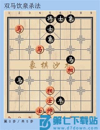 一方双马相依,左右盘旋,用一马控制住对方将门,另一马借抽将之机,跳到“九宫”另一侧将死对方。此种攻杀方法,称为“双马饮泉”。