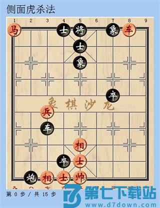 用马在对方三。四或七。四位置上,限制将的活动,然后用其他子力将死对方的杀法,称为“侧面虎”杀法。