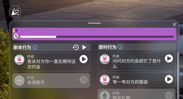 进入约会后,左上角会出现一个剧本行为和即时行为菜单,你可以自由选择互动方式: