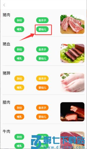 3、在肉类页面定位猪肉选项,点击婴幼儿标签查看对应信息。