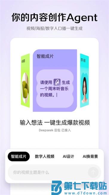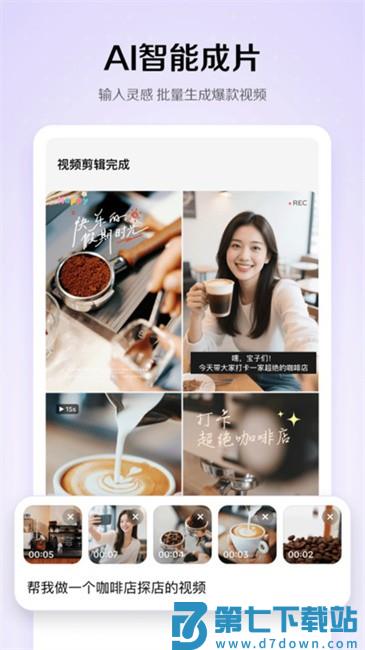 智能成片:不会剪辑缺乏灵感?只需输入创作主题,即可产出15-60秒爆款短视频,原始实拍与AI生成素材自然融合,小白也能轻松创作!