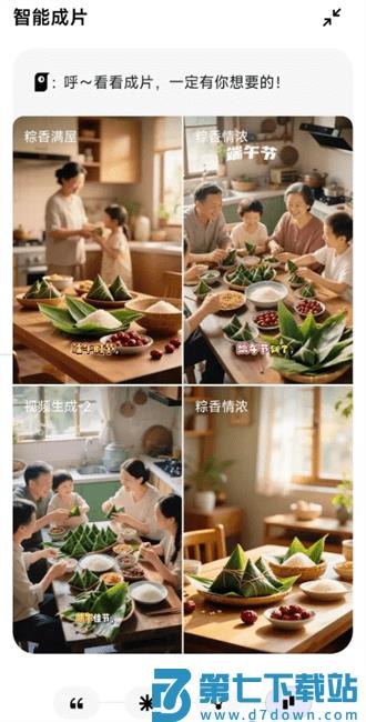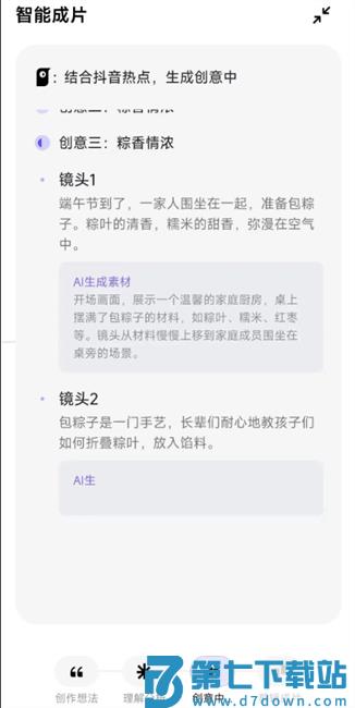 选择“智能成片”,在对话框输入想做的内容,比如“端午节一家人包粽子”