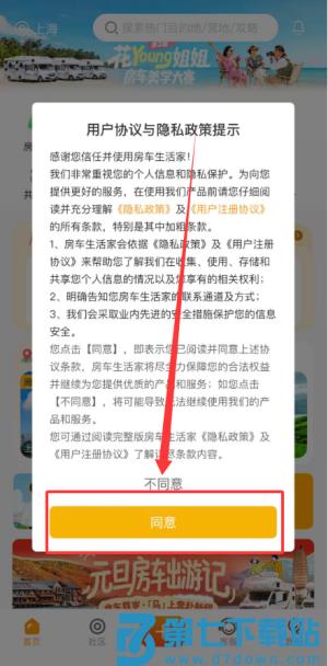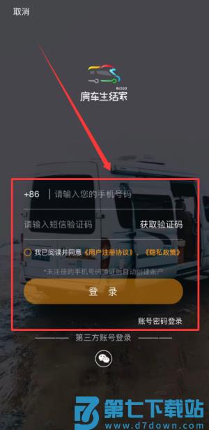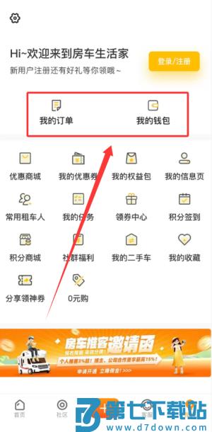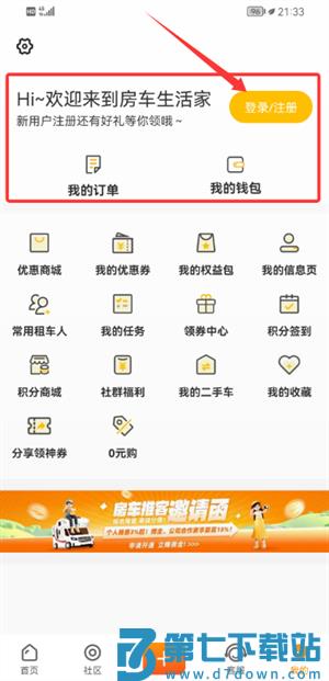 1、启动房车生活家应用,点击登录或注册完成账户的登入或创建。