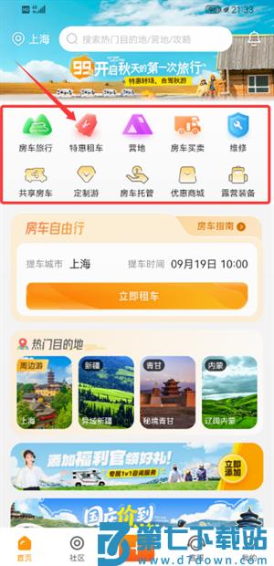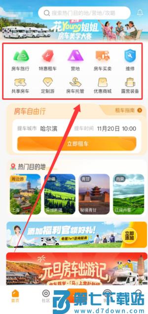 3、首页提供房车旅行服务、优惠租车、营地预订、车辆交易及行程定制功能。