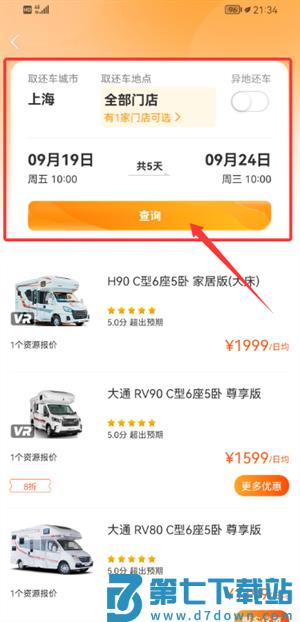 3、随后选定取还车城市、地点及时间,轻按“查询”浏览可选车辆列表。