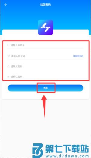 3、填写手机号码、短信验证码并设置新密码,最后点击“完成”提交,即可成功找回密码。