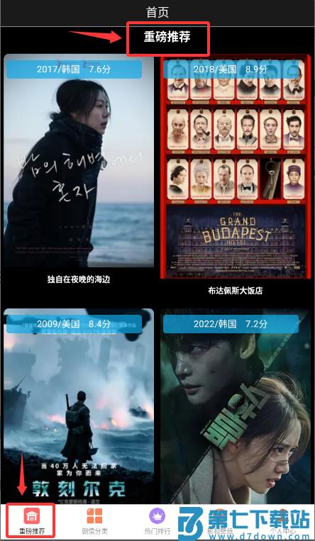2、于首页选择"重磅推荐"功能,浏览精选影视内容。