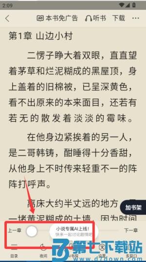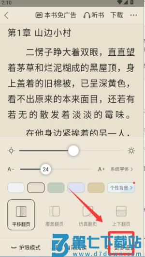 2、阅读时点屏幕中央调出菜单,可以设置字体大小和护眼背景。上滑翻页,长按文字能做笔记。