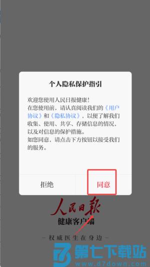 1、首次启动需阅读并确认用户协议条款,点击同意按钮后进入医疗健康应用主界面。