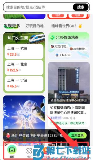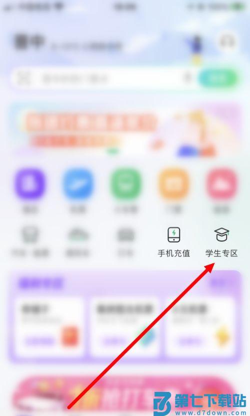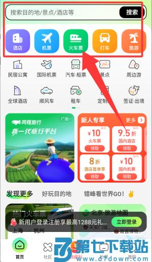 1.首先在界面下载同程旅行软件,在首页面找到并点击【学生专区】选项。