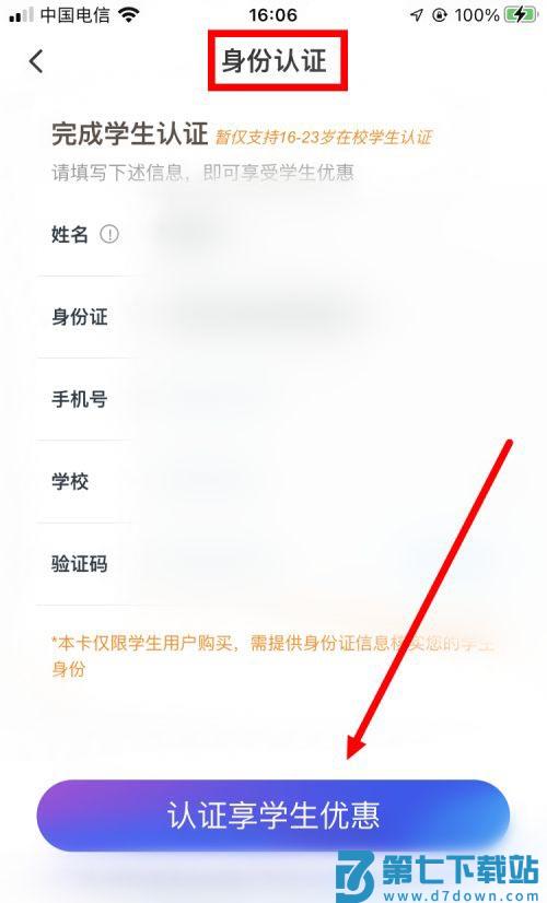 3.输入自己的【姓名】、【身份证号】、【手机号】、【学校】等信息,最后点击【认证享学生优惠】即可完成认证。