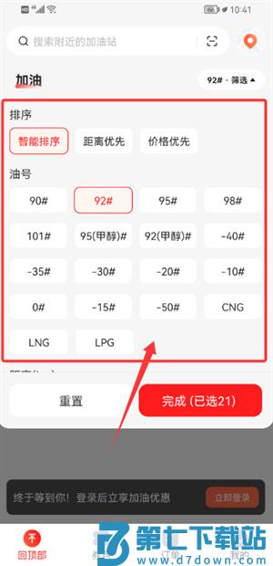 3、在筛选界面设置排序方式与油品类型,点击“完成”即可获取结果。