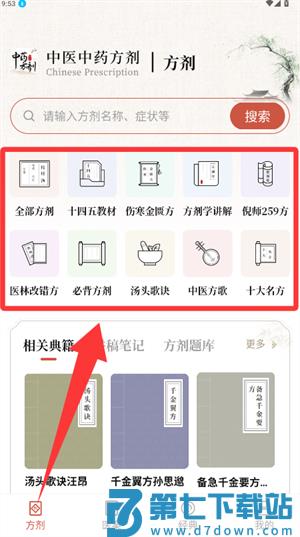 3、返回方剂界面选择分类,查看教材等对应方剂内容。