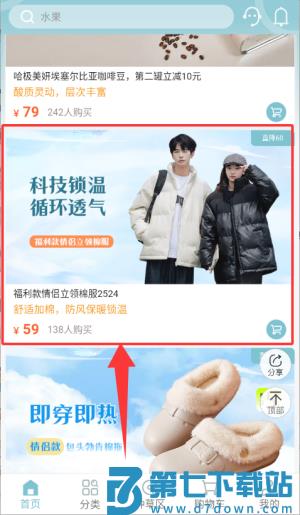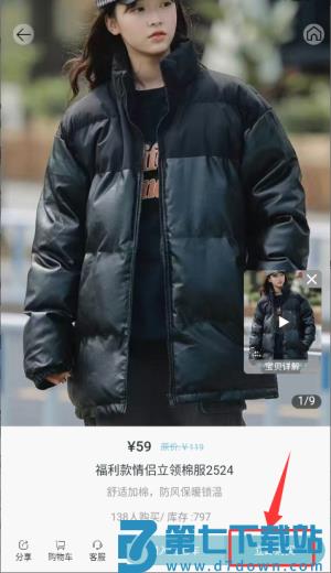 2、于首页挑选喜爱商品,例如福利款棉服,进入详情介绍页面。