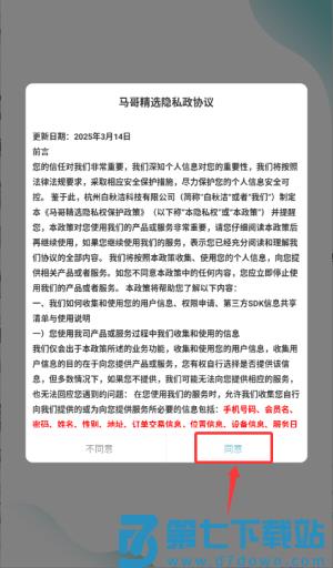 1、在马哥精选软件中点击"同意"隐私协议,启动应用程序。