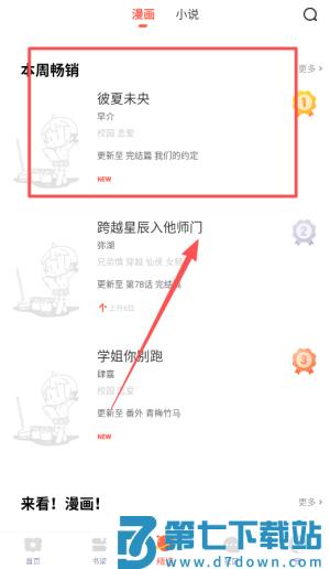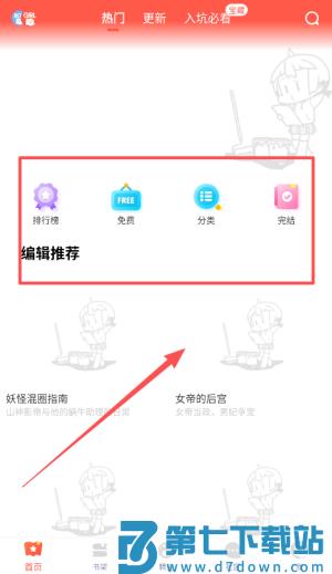 1、进入软件页面,红色框框哪里都是热门的漫画。