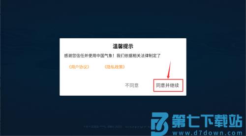1、启动中国气象应用,于提示页面点击同意并继续选项。