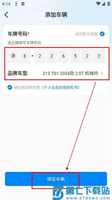 4.填写车牌号以及选择车型后点击“绑定车辆”
