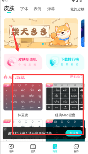 3、在皮肤中心定制个性化键盘背景,使用表情包匹配功能让对话更生动有趣。