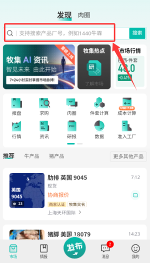 4、在主界面搜索栏输入产品信息,查询冻品相关市场内容。