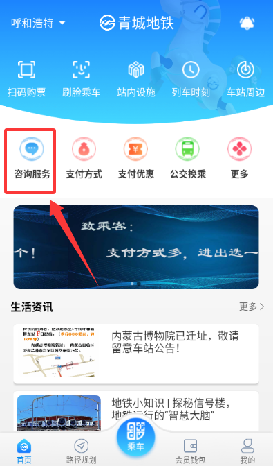 3、在首页选择咨询服务功能,获取地铁相关帮助。