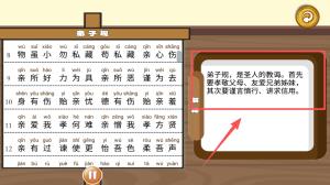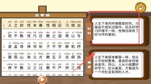 2.两种学习模式:一种分段朗读解释便于孩子家长共同理解学习三字经;一种全文顺序循环朗读,逐行跟踪滚动显示当前朗读内容,便于孩子跟随一起咏读学习。