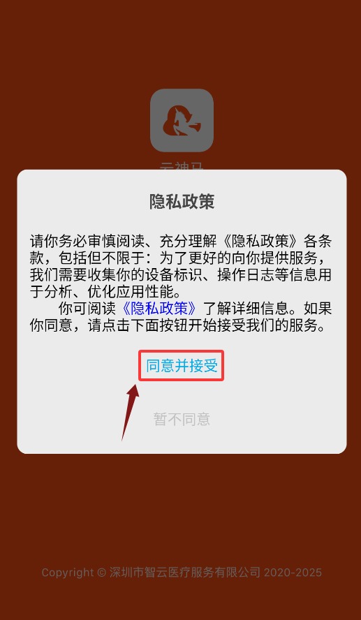 1、首次启动应用需点击同意隐私政策并继续,确认后方可进入主界面。