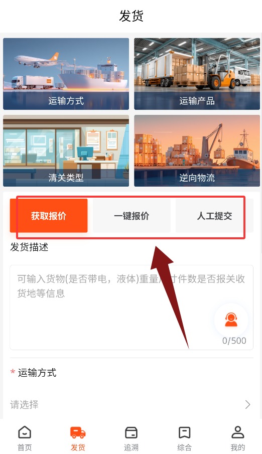 3、发货界面提供获取报价、一键报价与人工提交等多种服务。